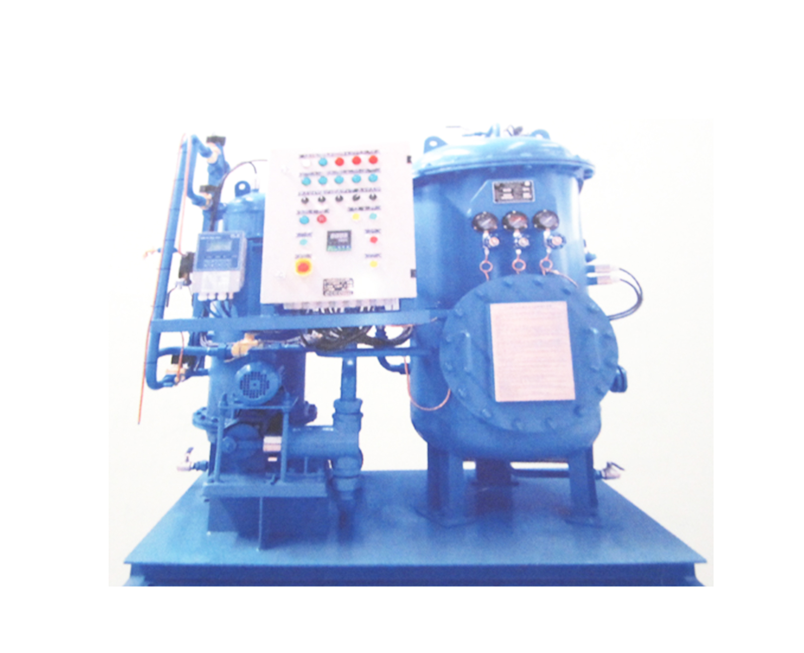 The ZFYS series 15ppm bilge separator is a gravity-type and isolating –type oil –filtering device. It is composed of separator .special –purpose pump, electric box,15ppm bilge alarm device, suction filters and other pipelines, valves and fittings. The separator adopts three-stage oil filtering mode, Bilge water is pumped into the first-stage oil-filtering room by the bilge water pump, where the first-stage separation is performed using the specific gravity difference of oil and water and the floating oil is separated from the water through the method of gravity, Small oil particles are coalesced together through the coalescer in the second-stage oil-filtering room ,and then be separated and float to the surface. Treated bilge water satisfying the discharge standard through the second-stage treatment will be directly discharged overboard as an effluent. If it still fails to meet the discharge standard after the second-stage treatment, and then the third-stage dialysis apparatus will be put into operation automatically to enable the emulsified oil to be separated oil and water and the bilge water to meet the discharge standard. The separated dirty oil is collected in the top of oil-filtering room. When the collected dirty oil reaches certain amount, it will be automatically discharged to the dirty oil tank.